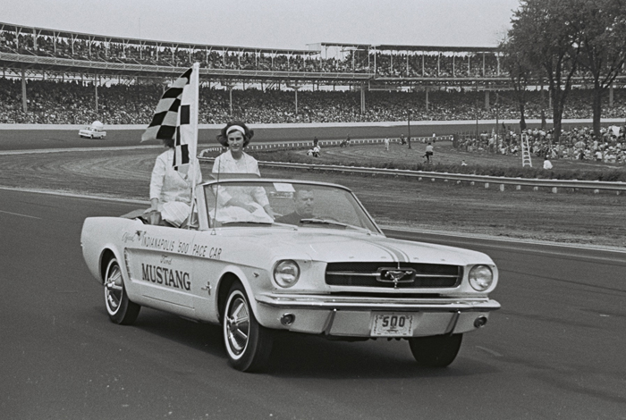 Benson Ford sits in sparkling new Ford Mustang - 1964 Indy 500 pace car. Photo courtesy IMS.