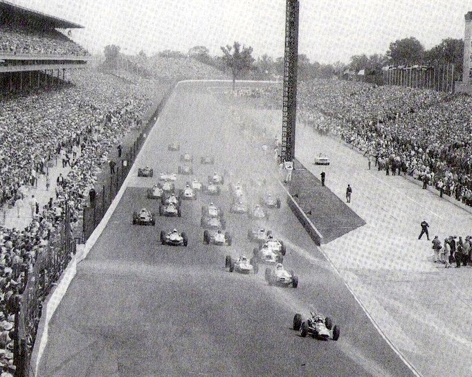 Pace Car off and the race goes green. Rear of Jimmy Clark's Lotus barely visible as the field enters turn 1. Getty Images