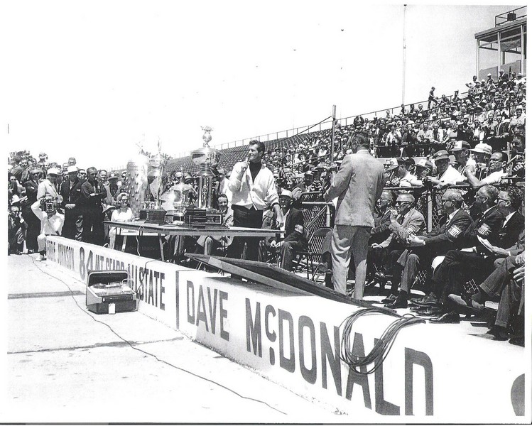 Drivers seated in makeshift stands enjoying the festivities. Dave MacDonald and Eddie Sachs are next to one another (middle of row 2)