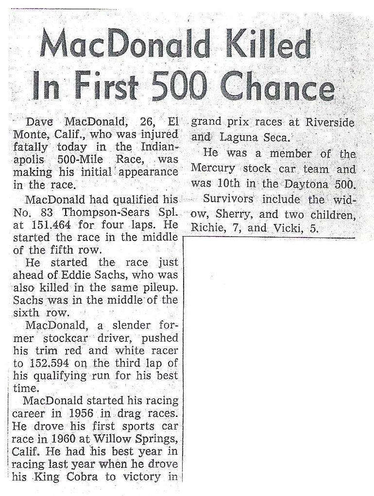 headlines will read. Two popular racers - Eddie Sachs and Dave MacDonald would die in the fiery crash. RIP Dave and Eddie. Photo IMS