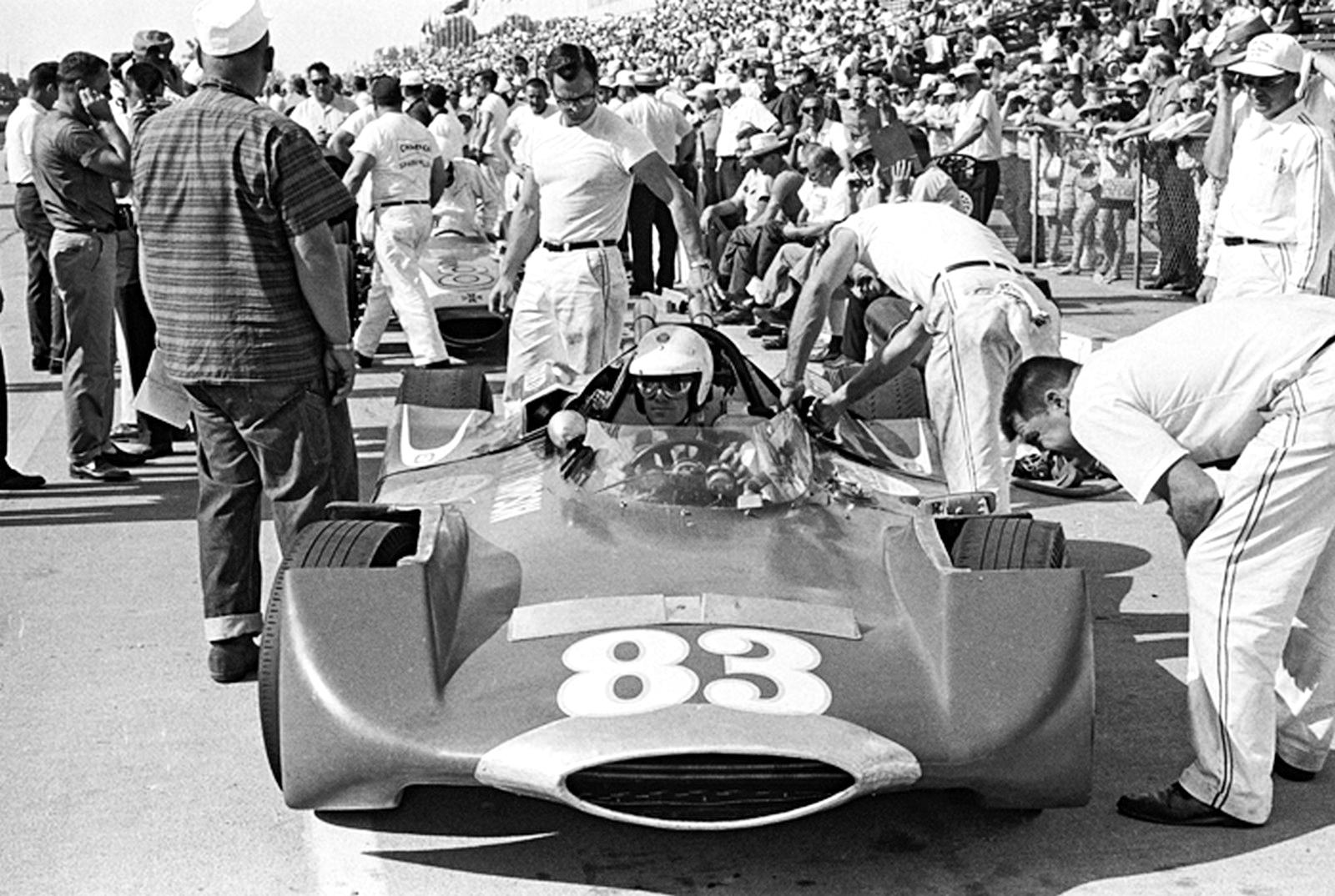 tires. Dave MacDonald's #83 racer pushed to the pit area and readied for initial testing. [The Henry Ford]