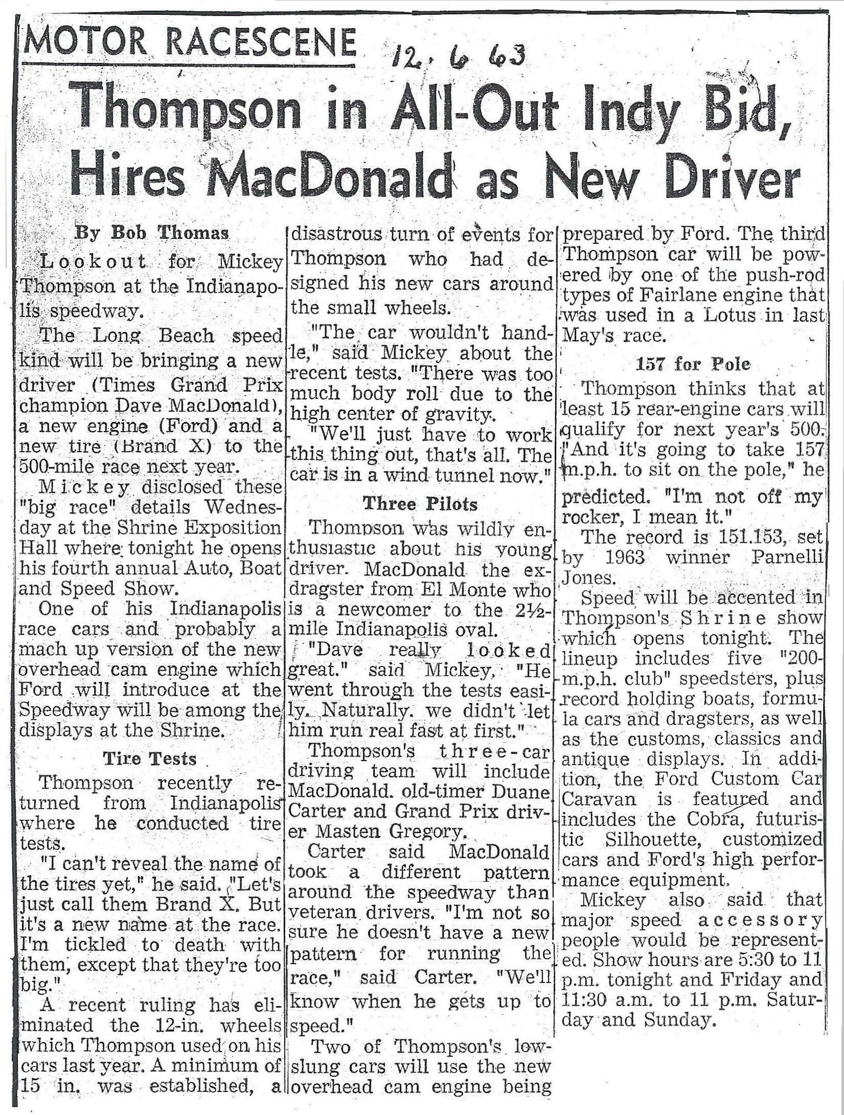 Dec 6, 1963 - Mickey Thompson describes the disappointing November test session to Los Angeles Times writer Bob Thomas. "The cars