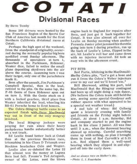 Newspaper & magazine articles recapping the May 11-12, 1963 weekend races at Cotati Raceway
