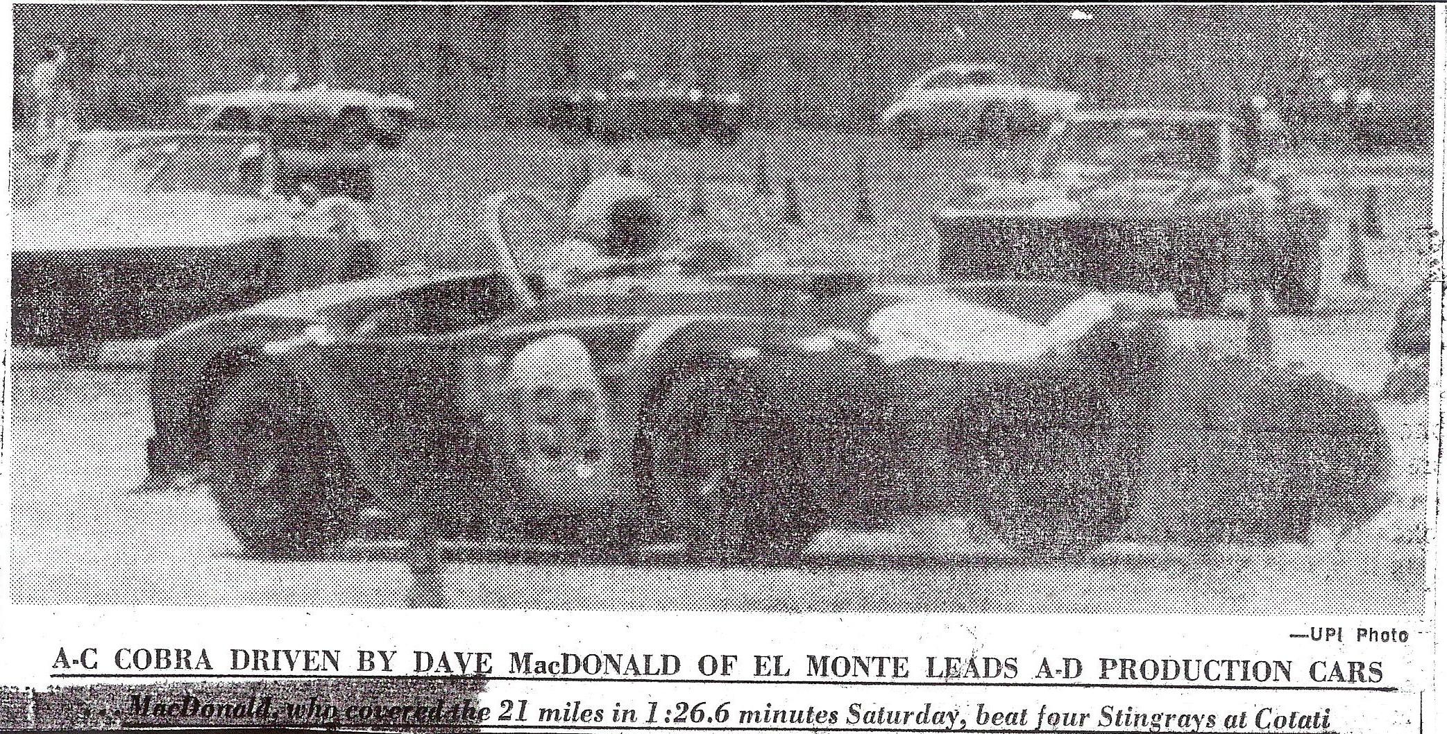 A repeat of Saturday's performance Dave MacDonald started slow but had his mighty Cobra Roadster all alone out front at the end.