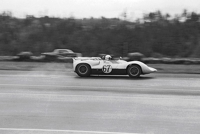 Hap Sharp has his Chaparral now running 2nd behind Dave MacDonald with one lap to go. Photo Dave Friedman