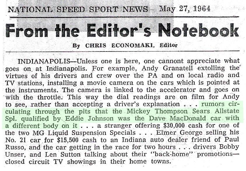 In the summer of 63 racer Dave MacDonald had agreed in principle to run Mickey Thompsons low slung "superskates" in the 1964 500.