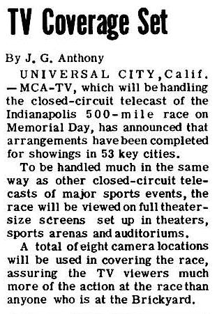 MCA-TV (Music Corporation of America) announced the first ever Indy 500 broadcast to a national closed-circuit TV audience